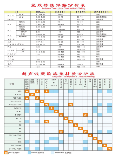 超聲波比較好焊接的塑料:非結晶聚合物ABS、PC、PS、PVC、PMMA:分子排列無序、有明顯的使材料逐步變軟、熔化 及至流動的溫度(Tg玻璃化溫度)。這類樹脂通常能有效傳輸超音速振動并在相當廣泛的壓力/振幅范圍內實現良好的焊接。