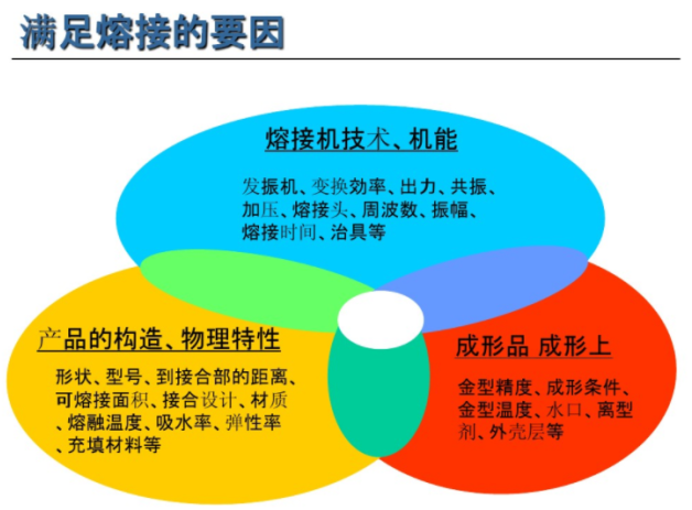 4.摩擦熔接:摩擦焊接是指利用熱塑性塑料之間相互摩擦所生成的摩擦熱,使摩擦面受熱熔融,經加壓并冷卻后,即可使其連接在一起的方法,分為振動熔接和旋轉熔接,振動熔接生產性,信賴性高,接合面形狀不受限制,應用于汽車部件,家電部件,旋轉熔接接合面只限定于圓形,圓形汽車部件及家電日用品部件,
