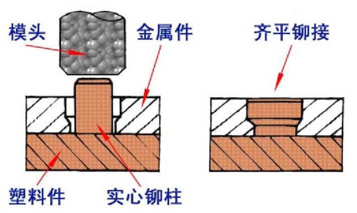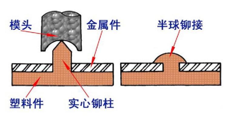 金屬與塑膠鉚接原理:塑膠件上的塑料柱,穿過金屬件的孔,熱熔頭(熱熔鉚接)/超聲波焊頭(超聲波鉚接)將塑料柱突出部分熔融,按照設(shè)計的鉚接形狀變成鉚釘形狀,使金屬與塑膠材料機械鉚接在一起,將金屬板固定住。金屬與塑料熱鉚接組裝是簡單、低廉、高效、簡易的性固定裝配的有效方法。在型模作用下延展再成型,多點同時進行鉚接固定,無須外加零部件、填料和其它費用,熱塑性材料依此方法裝配牢固、緊固又堅固。簡而言之,組件上的所有各個緊固部位同時加熱塑化,然后用激冷模頭施壓后使其延展變形、冷卻成形鉚固,許多部件組合成牢固的整體組件,事實證明優(yōu)于其它常用的傳統(tǒng)方法,無須其它填充材料,明顯減少材料消耗、降低成本。